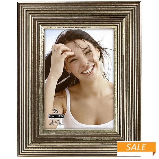 Product Details Malden Designs® GOLD RIDGE 5x7 frame by Malden® — GOLD RIDGE is a big, beautiful moulding style that really grabs your attention.Stepped detail is enhanced with the satin gold stain.Modern, dual function easel back for portrait or landscape use.Crafted by Malden Design®. To view the full frame collection, click Malden Frame Collection. GOLD RIDGE 5x7 frame by Malden® Model #096287146524 List $12.50 You pay $5.90 In stock Can be shipped today [?] Your Price Match is Active Your request for a price of $0.00 for a minimum quantity of has been accepted. You have [time] left to purchase this item for $0.00 instead of $5.90 each. Find a Lower Price? We BEAT All Authorized Retailers [?] FEATURESDisplays:5"x7"Material:Wood (full grain)Finish:GoldOccasion:Anniversary, Business & office, Corporate gifts, Engagement, Graduation, Home decoratingStyle:Contemporary, SophisticatedOrientation:BothBrand:Malden Designs®Display Type:Desktop or Wall Approx. Overall Dimensions:8 5/8"x10 1/4"x1 1/2" This item ships in its own box SHARE THIS ITEM Share on Facebook