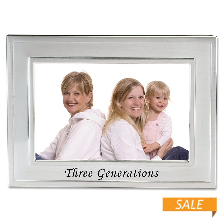 Main view Close-up Product Details Lawrence Frames® THREE GENERATIONS 6x4 frame — Family members love this brushed silver expression frame. Add your favorite photo and delight the whole family with the memories. Beautifully engraved with Three Generations Fashioned in pretty polished silver plate. Glare resistant glass lens.By Lawrence®, fine frames for generations. THREE GENERATIONS 6x4 frame Model #751148059497 List $24.50 You pay $10.90 In stock Ships next business day [?] Your Price Match is Active Your request for a price of $0.00 for a minimum quantity of has been accepted. You have [time] left to purchase this item for $0.00 instead of $10.90 each. Find a Lower Price? We BEAT All Authorized Retailers [?] FEATURESDisplays:4"x6"Material:SilverplateFinish:SilverOccasion:Grandparent`s Day, InspirationalStyle:Contemporary, Words & whimsyOrientation:Horizontal OnlyBrand:Lawrence Frames® Approx. Overall Dimensions:7 3/8"x5 3/8"x5/8" This item ships in its own box SHARE THIS ITEM Share on Facebook
