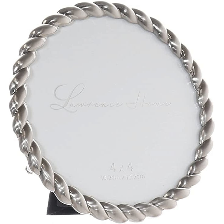Main view Product Details Lawrence Frames® BRUSHED NICKEL ROPE 4x4 Round frame — A simple and elegant impressive silver frame with rope silhouette. Wonderful desk appeal; or use the wall mounts for easy hanging. Glare resistant glass lens.By Lawrence®, fine frames for generations. BRUSHED NICKEL ROPE 4x4 Round frame Model #751148085588 List $24.00 You pay $18.95 This item IS in stock and can be expected to ship 02/13/2026 Your Price Match is Active Your request for a price of $0.00 for a minimum quantity of has been accepted. You have [time] left to purchase this item for $0.00 instead of $18.95 each. Find a Lower Price? We BEAT All Authorized Retailers [?] FEATURESDisplays:4"x4"Material:SilverplateFinish:SilverOccasion:Anniversary, Birthday, Business & office, Home decorating, WeddingStyle:Classic, Contemporary, TraditionalBrand:Lawrence Frames®Display Type:Desktop Only This item ships in its own box SHARE THIS ITEM Share on Facebook
