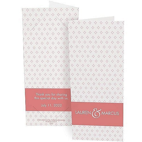 Back to results Scroll Items 7766 of 11043 Product Details Collectors Gallery DIAMONDS Personalized Photo Strip holders for 2x6 Photobooth Prints — Photo booths are popular at weddings, sweet 16 parties, quinceaneras, bar/bat mitzvahs, graduations, anniversaries, family reunions, holiday parties, festivals, and corporate events. Give guests something to take their photo strips home in with a personalized folder. Choose from any of our customizable designs, or create a folder unique for your event. All designs are printed on smooth, lightweight 12 pt. paper stock and hold a classic 2" x 6" picture strip. Whether it's a party favor or a marketing piece for your company, photo booth folders make great event souvenirs. An inexpensive party favor Overall size measures 3" x 7" (when closed) Holds a 2" x 6" photo (for photobooth strips) Lightweight smooth finish paper Inside corner die-cuts hold picture in place Shipped flat, not folded FREE personalization included in the price Envelopes are not available Sold in increments of 10; minimum 100 folders. DIAMONDS Personalized Photo Strip holders for 2x6 Photobooth Prints Model #021352012121 $9.90 ( set of 10 / $0.99 ea ) This item can be expected to ship by 02/24/2026. Order now by clicking ADD TO CART (below); you are only charged when we actually ship. Or, Click here to be automatically notified when it comes back in stock. Your Price Match is Active Your request for a price of $0.00 for a minimum quantity of has been accepted. You have [time] left to purchase this item for $0.00 instead of $0.99 each. Find a Lower Price? We BEAT All Authorized Retailers [?] FEATURESDisplays:2"x6"Material:Card-stockFinish:Multi-Color, Pink, WhiteOccasion:Group Events + Parties, WeddingStyle:Bold Colors, Contemporary, Pop Culture, Words & whimsyDisplay Type:not applicable n/a Approx. Overall Dimensions:3"x7" SHARE THIS ITEM Share on Facebook