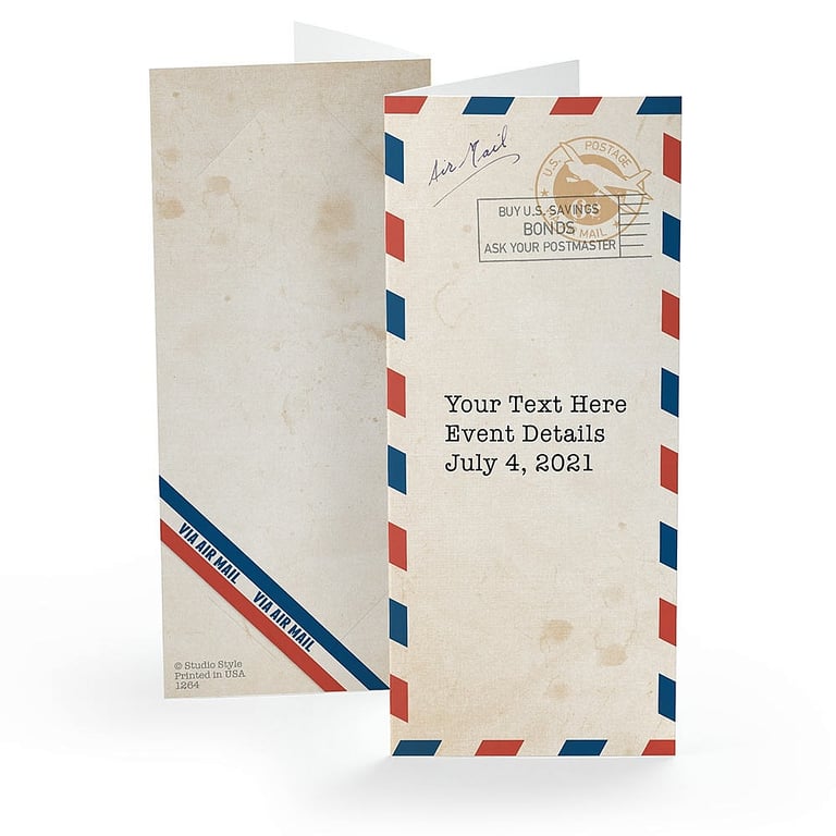 Back to results Scroll Items 7797 of 11043 Main view Product Details Collectors Gallery VINTAGE AIRMAIL ENVELOPE Personalized Photo Strip holders for 2x6 Photobooth Prints — Photo booths are popular at weddings, sweet 16 parties, quinceaneras, bar/bat mitzvahs, graduations, anniversaries, family reunions, holiday parties, festivals, and corporate events. Give guests something to take their photo strips home in with a personalized folder. Choose from any of our customizable designs, or create a folder unique for your event. All designs are printed on smooth, lightweight 12 pt. paper stock and hold a classic 2" x 6" picture strip. Whether it's a party favor or a marketing piece for your company, photo booth folders make great event souvenirs. An inexpensive party favor Overall size measures 3" x 7" (when closed) Holds a 2" x 6" photo (for photobooth strips) Lightweight smooth finish paper Inside corner die-cuts hold picture in place Shipped flat, not folded FREE personalization included in the price Envelopes are not available Sold in increments of 10; minimum 100 folders. VINTAGE AIRMAIL ENVELOPE Personalized Photo Strip holders for 2x6 Photobooth Prints Model #021352012640 $9.90 ( set of 10 / $0.99 ea ) This item can be expected to ship by 02/24/2026. Order now by clicking ADD TO CART (below); you are only charged when we actually ship. Or, Click here to be automatically notified when it comes back in stock. Your Price Match is Active Your request for a price of $0.00 for a minimum quantity of has been accepted. You have [time] left to purchase this item for $0.00 instead of $0.99 each. Find a Lower Price? We BEAT All Authorized Retailers [?] FEATURESDisplays:2"x6"Material:Card-stockFinish:Gray/Charcoal, SilverOccasion:Bar & Bat Mitzvah, Group Events + PartiesStyle:Antique, Pop Culture, , Words & whimsyDisplay Type:not applicable n/a Approx. Overall Dimensions:3"x7" SHARE THIS ITEM Share on Facebook