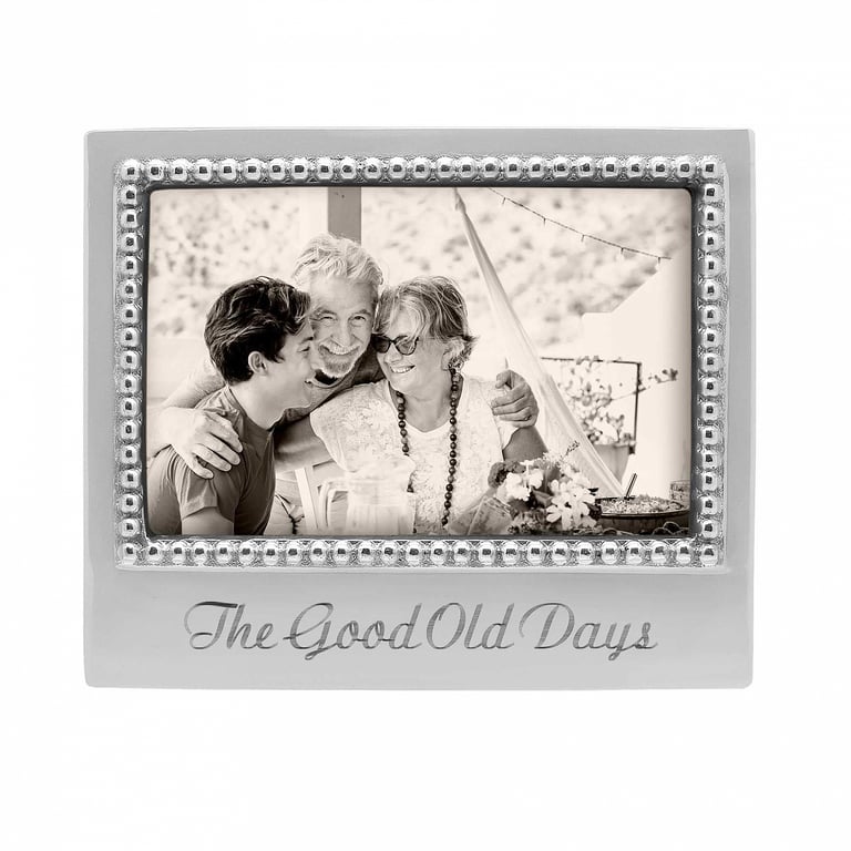 Main view Personalize Gifts for every occasion Product Details Mariposa® THE GOOD OLD DAYS 6x4 beaded frame by Mariposa® — Here, the STATEMENT frame for 6"x4" photos engraved with the sentiment The Good Old Days SendAFrame stocks the entire Mariposa® picture frame collection. Shop the entire collection: Mariposa® Design Collection Important Note: Mariposa items are hand engraved. Your piece may differ slightly from the photo. THE GOOD OLD DAYS 6x4 beaded frame by Mariposa® Mariposa® WINTER CELEBRATION Savings - Buy More / Save More * Add this item to your cart for the full details of this promotion. Conditions may apply. Model #808813178424 $56.00 only 2 left, order soon. In stock Ships next business day [?] Your Price Match is Active Your request for a price of $0.00 for a minimum quantity of has been accepted. You have [time] left to purchase this item for $0.00 instead of $56.00 each. Find a Lower Price? We BEAT All Authorized Retailers [?] FEATURESDisplays:4"x6"Material:AluminumFinish:SilverOccasion:Birthday, Celebrating Travels, Friendship, RetirementStyle:Contemporary, Eco-Friendly-Recycled, Shabby Chic, Sophisticated, Words & whimsy, Sentiments | ready madeBrand:Mariposa®Display Type:Desktop Only Approx. Overall Dimensions:6 3/4"x5 3/4"x1" This item ships in its own box SHARE THIS ITEM Share on Facebook