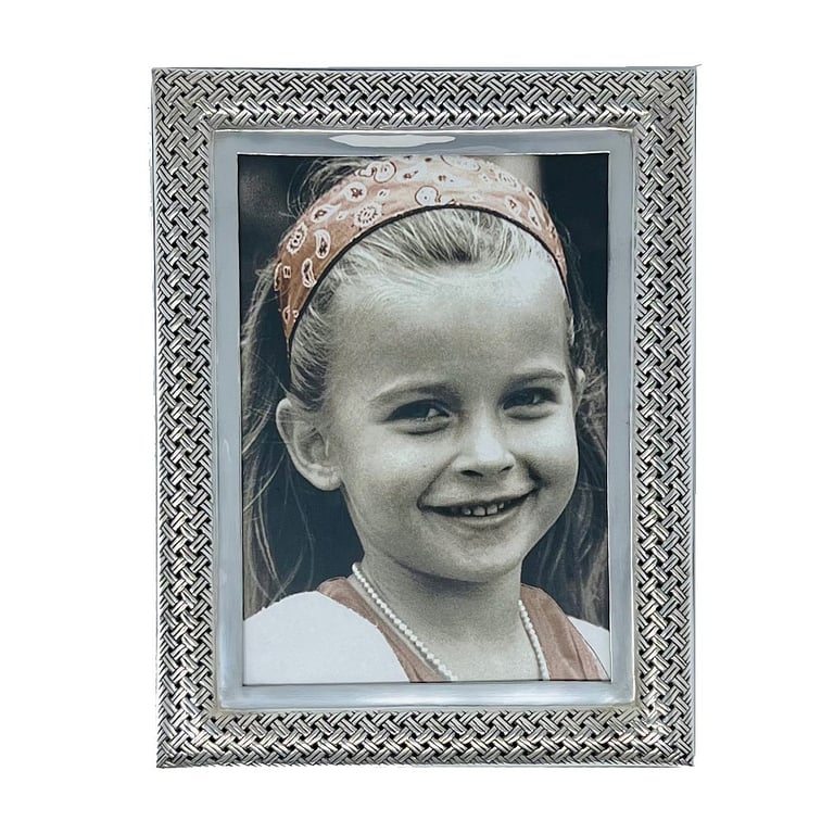 Main view Product Details John Hardy® Bali BEDEG series 5x7 fine sterling silver frame by John Hardy® — Intricately hand-woven (like cloth - but this is sterling silver!), the BEDEG collection designer John Hardy shows the winding, spiraling effect of chain weaving.Hardy and his artisans are recognized as masters of this art. Still, it is a process that takes hours to produce an inch or two.Pure .925 fine Sterling Silver. Rare wood hand finished back. Special JH signature gift packaging.Produced by and imported from John Hardy®, Bali. BEDEG series 5x7 fine sterling silver frame by John Hardy® Model #612802006724 List $650.00 You pay $445.00 In stock Can be shipped today Your Price Match is Active Your request for a price of $0.00 for a minimum quantity of has been accepted. You have [time] left to purchase this item for $0.00 instead of $445.00 each. Find a Lower Price? We BEAT All Authorized Retailers [?] FEATURESDisplays:5"x7"Material:Sterling Silver (fine)Finish:SilverOccasion:Birthday, Congratulations, Home decorating, Romantic, WeddingStyle:Contemporary, Romantic, Distinctive, Unique | Limited, Heirloom / HeritageOrientation:BothBrand:John Hardy® BaliDisplay Type:Desktop Only This item ships in its own box SHARE THIS ITEM Share on Facebook