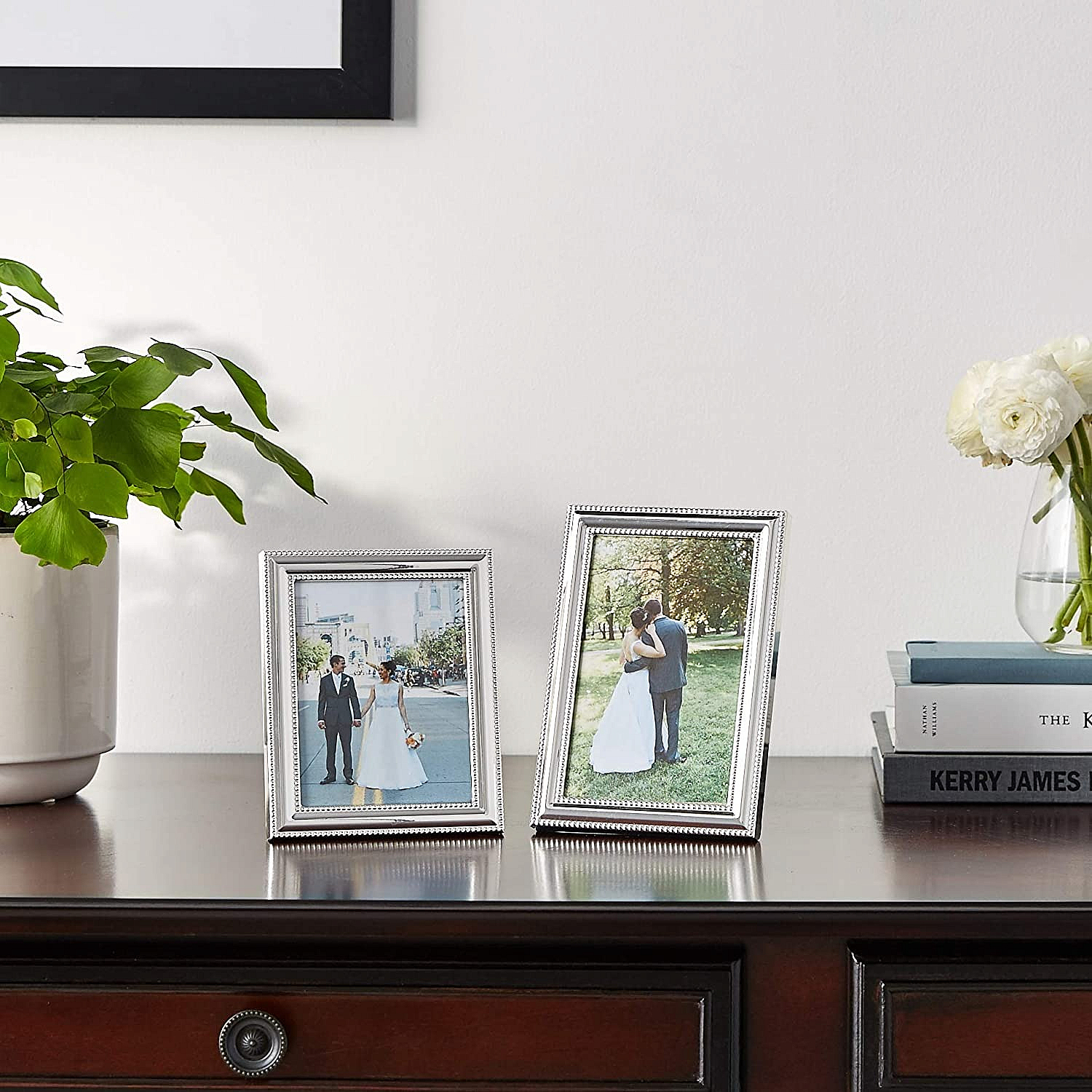 Back to results Scroll Items 8042 of 11088 Family Members 4"x6" - (triple) beaded silver $45.95 5"x7" - (triple) beaded silver $65.95 4"x6" - silver beaded $16.95 5"x7" - silver beaded $20.95 8"x10" - silver beaded $25.95 4"x6" - (dbl) silver beaded $28.95 5"x7" - (dbl) silver beaded $47.95 5"x5" - silver beaded square $17.95 4"x5" - (triple) beaded silver $42.95 8"x10" - (triple) beaded silver $89.95 8"x10" - (dbl) silver beaded $52.95 4"x5" - (dbl) silver beaded $28.95 Main view Product Details Lawrence Frames® Polished silver 4x5 w/caviar-bead trim — Our polished silver plate frame is nicely crafted with invisible seams and corners.Attractively backed with a high quality navy velvet for wonderful desk appeal.Dual easel back for portrait or landscape tabletop display. Glare resistant glass lens. Channel back construction.By Lawrence®. Click the Lawrence Frame collection to shop the entire line. Polished silver 4x5 w/caviar-bead trim Lawrence® HOLIDAY CELEBRATION Savings: Buy More / Save More * Add this item to your cart for the full details of this promotion. Conditions may apply. Model #751148062190 List $22.50 You pay $17.95 In stock Can be shipped today [?] Your Price Match is Active Your request for a price of $0.00 for a minimum quantity of has been accepted. You have [time] left to purchase this item for $0.00 instead of $17.95 each. Find a Lower Price? We BEAT All Authorized Retailers [?] FEATURESDisplays:4"x5"Material:SilverplateFinish:SilverOccasion:Anniversary, Birthday, Good luck, Mother`s Day, Retirement, Romantic, Teacher gifts, Thank-Motivate-Reward, Celebrating Travels, WeddingStyle:Classic, Traditional, RomanticOrientation:BothBrand:Lawrence Frames®Display Type:Desktop or Wall This item ships in its own box SHARE THIS ITEM Share on Facebook
