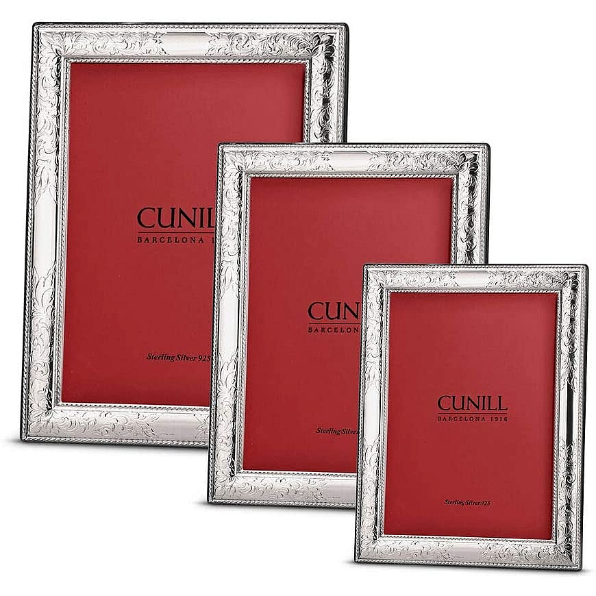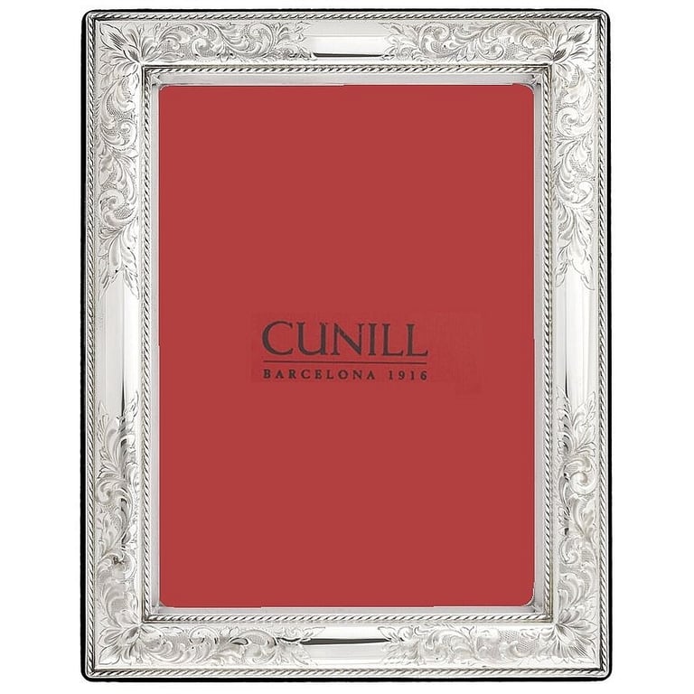 Main view sample back Mfr authenticity mark Product Details Cunill® Silver VINTAGE pure Sterling Silver luxe frame 8x10 by Cunill® — The VINTAGE frame features Cunill’s classic Vincenza design, hand-etched with intricate ornamental detail that rewards close inspection. Each piece features a silver face formed from a single sheet of fine sterling silver—a distinction you can see in the crisp definition of the engraving and feel in the substantial weight of the frame. Details matter throughout. The fitted wood backing securely locks in your photograph and gives the frame the presence of a finished decorative object. The signature sterling lozenge latch, a Cunill hallmark since 1916, and the debossed family mark with the .925 stamp quietly affirm its authenticity. Cunill sterling is finely lacquered, so it will never require polishing and will remain tarnish-free over time. Crafted in, and imported from, Cunill Italy®. SendAFrame is a full-line Cunill® frame collection distributor. Looking for other true Sterling Silver 8x10" frames? click here VINTAGE pure Sterling Silver luxe frame 8x10 by Cunill® Model #742137118455 List $330.00 You pay $298.95 In stock Ships next business day Your Price Match is Active Your request for a price of $0.00 for a minimum quantity of has been accepted. You have [time] left to purchase this item for $0.00 instead of $298.95 each. Find a Lower Price? We BEAT All Authorized Retailers [?] FEATURESDisplays:8"x10"Material:Sterling Silver (fine)Finish:SilverOccasion:Anniversary, Baptism + Christening, Bar & Bat Mitzvah, Birthday, Communion, Engagement, Friendship, Good luck, Graduation, Romantic, Sweet 16, WeddingStyle:Antique, Florals, Ornate, Romantic, SophisticatedOrientation:BothBrand:Cunill® SilverDisplay Type:Desktop Only This item ships in its own box SHARE THIS ITEM Share on Facebook