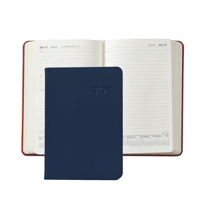Main view Product Details Graphic Image® 2026 8in BLUE Daily Journal TRADITIONAL Leather by Graphic Image™ — The 8-inch planner is a journal and diary in one, offering day-at-a-view appointment pages. Also included in this 416 page book are calendar, appointment and resource pages. Crafted in Traditional (smooth) full-grain leather Size: 5½x8", 416 pages Week and Day-at-a-view pages Smyth sewn for strength and longevity Cream-white, acid-free paper with gold gilt edges Date is pre-stamped blind Personalization is available - click the link Personalize This Item Individually bench-crafted in America Makes a great corporate gift. click the link Request A Quote for quantity pricing. Calendar & appointment pages include: Previous, current and next year's calendars Month-at-a-View appointment pages Next-year-planning pages Includes information pages on: U.S. and International holidays Personal birthday and anniversary record Gifts appropriate for selected anniversaries Zodiac dates and symbols Birthstone and flower for each month Personal expense summary Personal telephone directory U.S. and Canadian area codes, International dialing codes Toll-free numbers for airlines, railroads, car rentals, courier services, lost credit cards, hotels, motels, and resorts United States and International road and air distances United States and International weather World Times Zones International travel information Currency exchange rates Foreign embassies in the United States Weight and measure equivalents and conversion By the Graphic Image® Company. To view the complete collections, click: Graphic Image® photo albums and books.. 2026 8in BLUE Daily Journal TRADITIONAL Leather by Graphic Image™ Model #611959774371 $110.00 This item IS in stock and can be expected to ship 02/04/2026 Your Price Match is Active Your request for a price of $0.00 for a minimum quantity of has been accepted. You have [time] left to purchase this item for $0.00 instead of $110.00 each. Find a Lower Price? We BEAT All Authorized Retailers [?] FEATURESDisplays:5.50"x8"Material:Leather (fine)Finish:BlueOccasion:Back to School, Business & office, Christmas, Corporate gifts, Employee honors, Friendship, Good luck, Graduation, Hanukkah, Thank-Motivate-RewardStyle:Classic, Traditional, Sophisticated, ContemporaryBrand:Graphic Image®Display Type:not applicable n/a Approx. Overall Dimensions:5 1/2"x8" This item ships in its own box SHARE THIS ITEM Share on Facebook